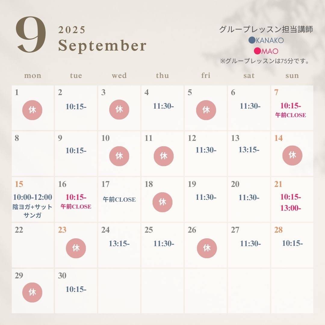 2025/08/22 9月スタジオスケジュールをアップしました。 今回は、マンツーマンレッスンについて予約可能な時間帯も記載してみました!少し分かりやすくなったかな?と思います。 そして、来月は久しぶりの陰ヨガ+…